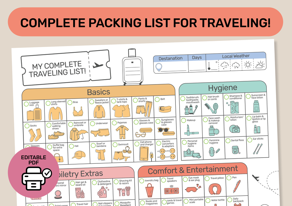 This Complete packing list for traveling printable checklist is great for planning your next travel!