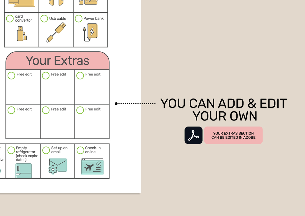 Visual icons + text for a quick and easy way to choose exactly what to pack in your hand bag and your luggage.